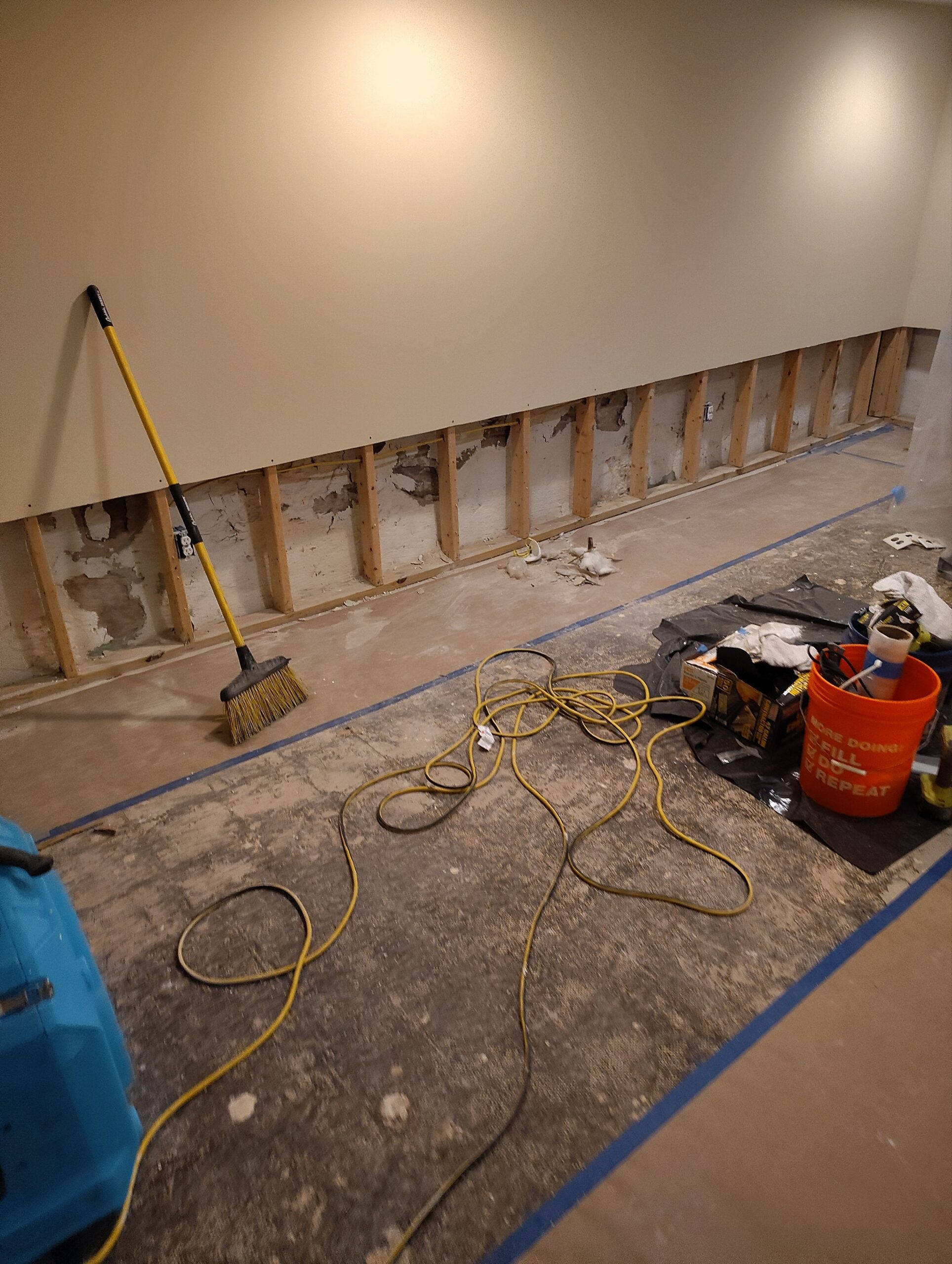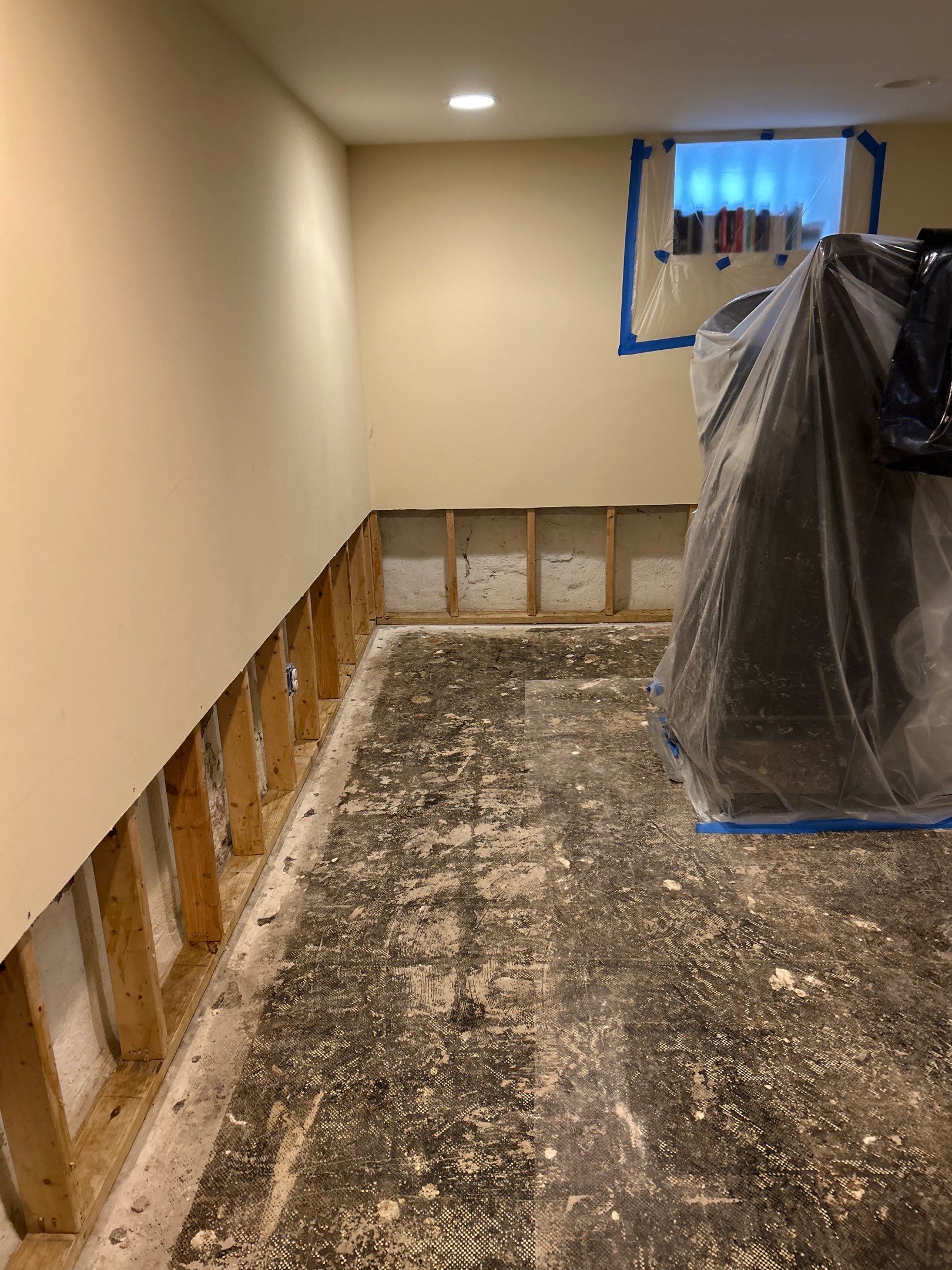 Customer had water come back into the basement we had to rip out all the contaminated walls dry the floors properly with fans and dehumidifiers and then rip out any contaminated carpet and do it material then clean and disinfect all surfaces and set up a dehumidifier and properly drive the basement and provide a warranty and certification