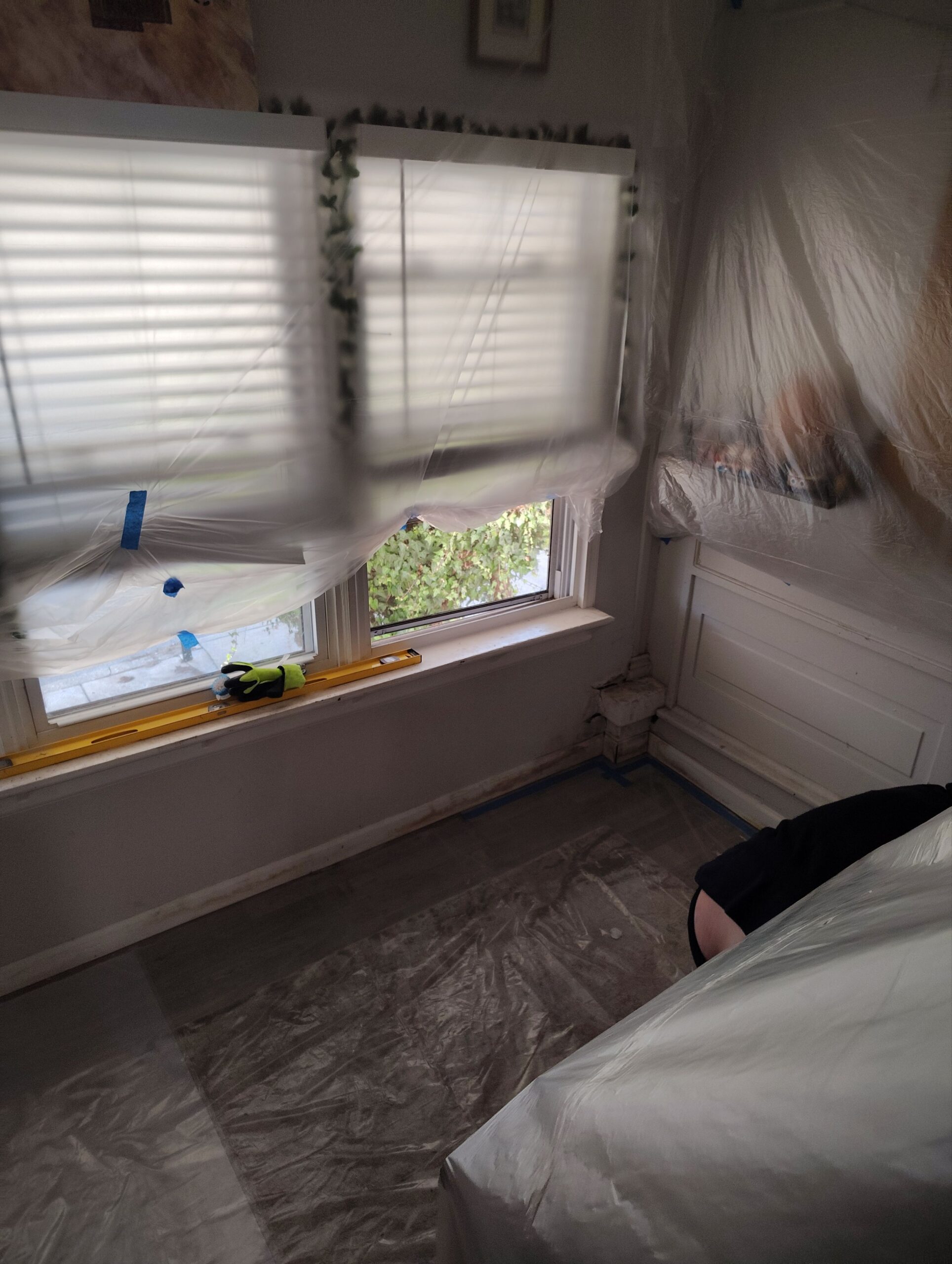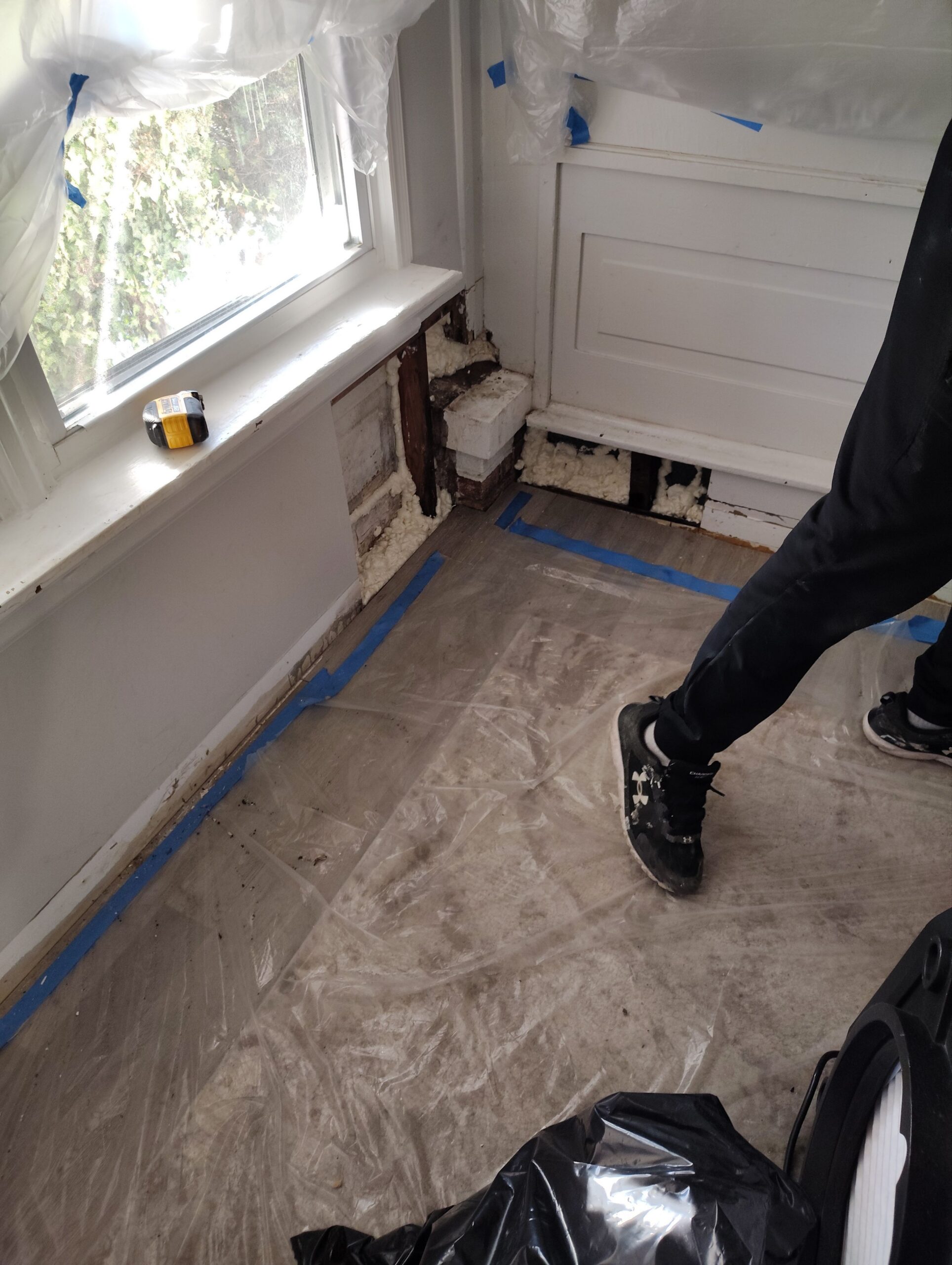 When we got to this Philadelphia home, we could see that water had been leaking through the front windows for some time. The sheetrock below the windows was soaked and covered with dark mold on the back side. Once we opened up the walls, we found heavy mold growth on the framing and the paper backing of the drywall. Some of the wood framing was rotted and falling apart from long-term water exposure. We set up plastic containment sheeting around the room and placed a HEPA air scrubber to keep the air clean. Blue protective tape was laid across the flooring to keep the rest of the home safe during the work.