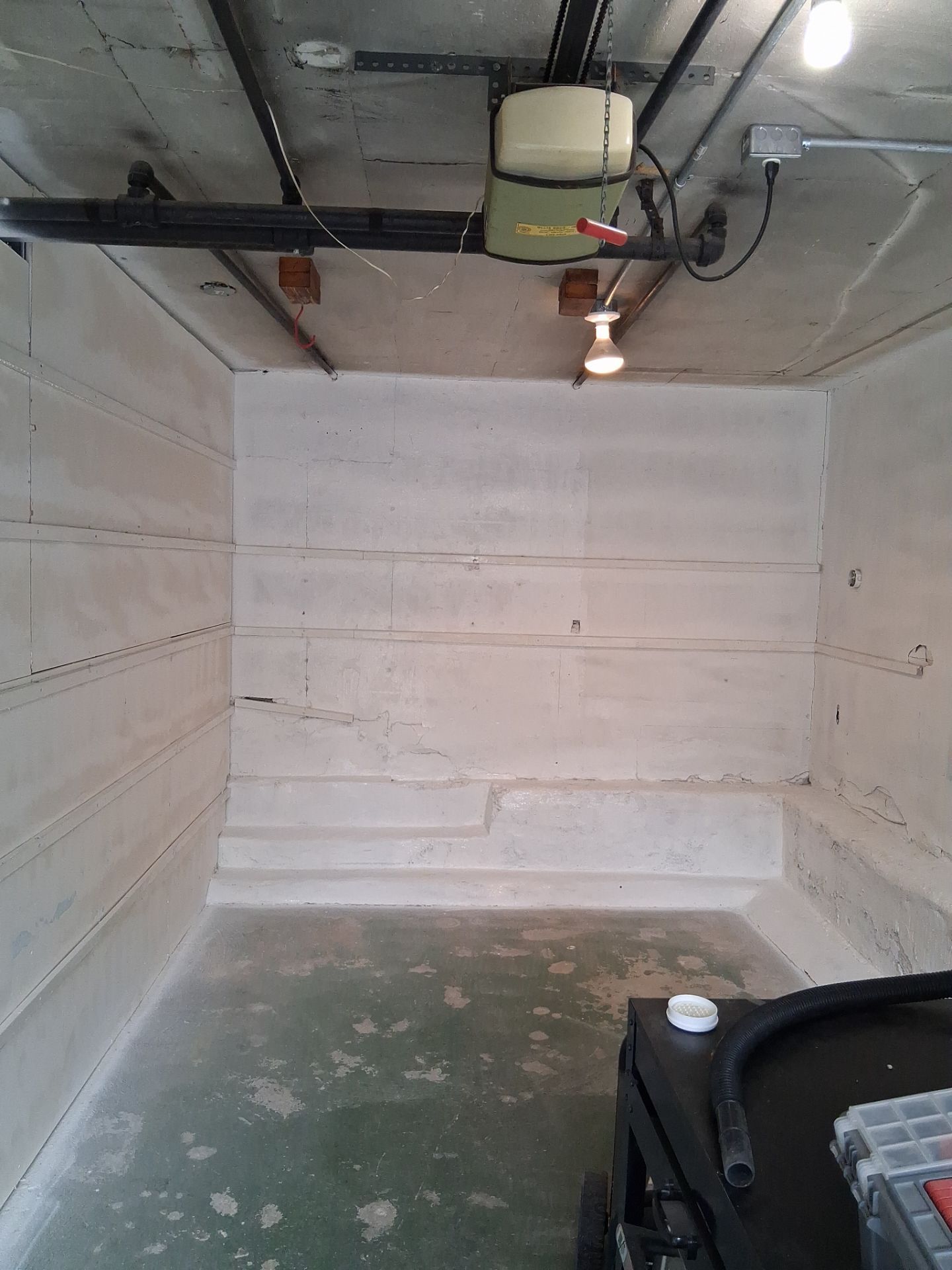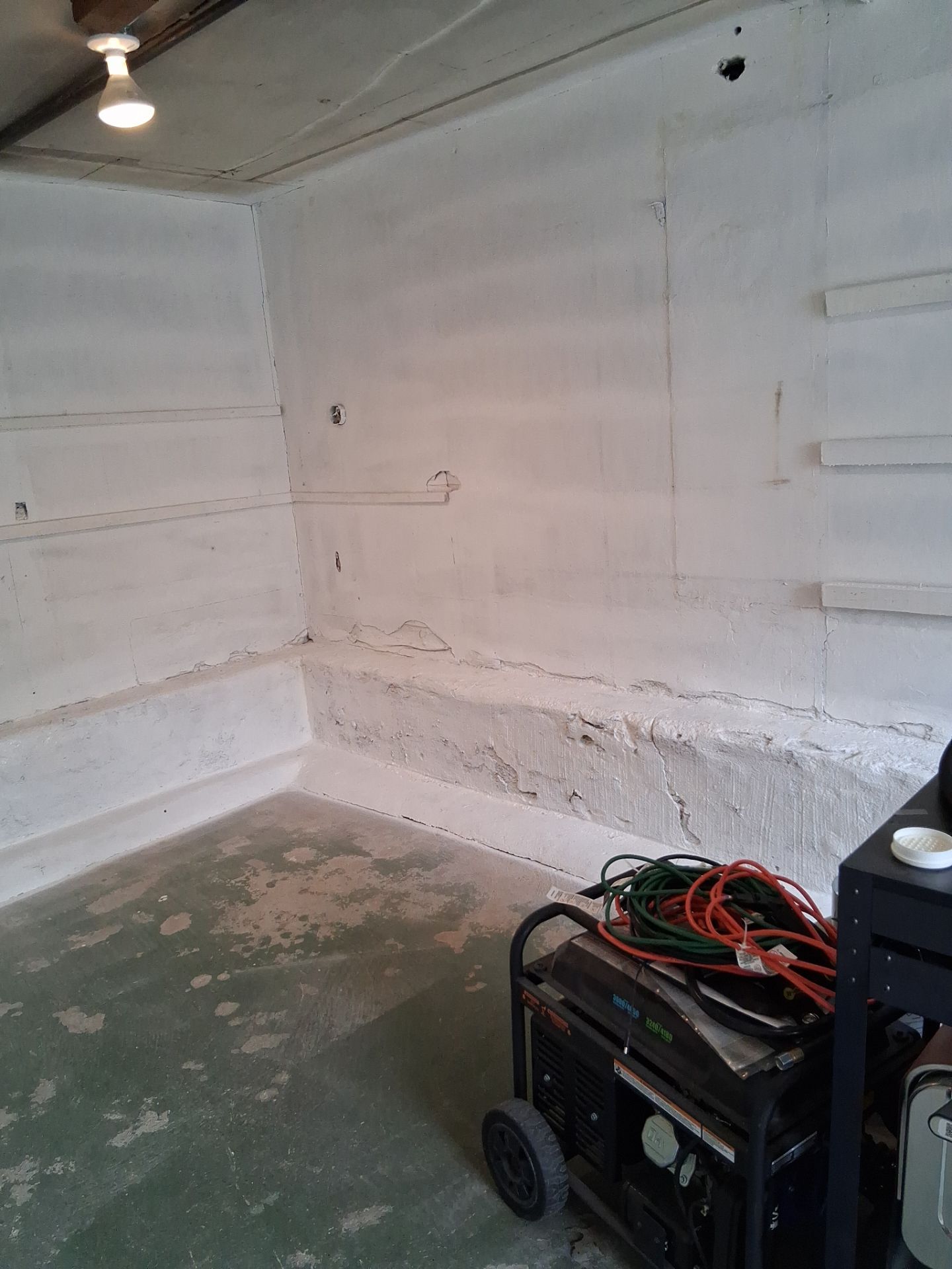 The garage walls are now fully cleaned, treated, and sealed with a fresh white coating over the concrete block. All mold-contaminated sheetrock has been removed, and the surfaces are safe and dry. The homeowner can move forward with confidence knowing the space has been certified and protected.